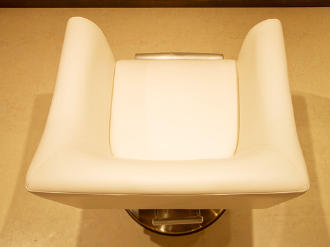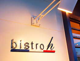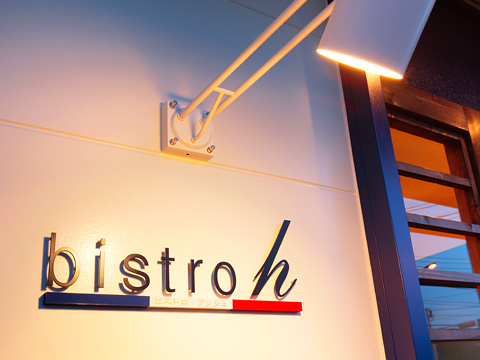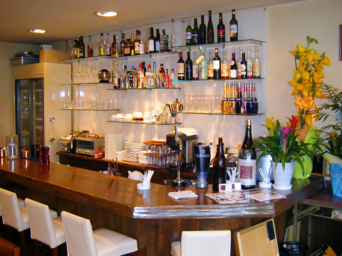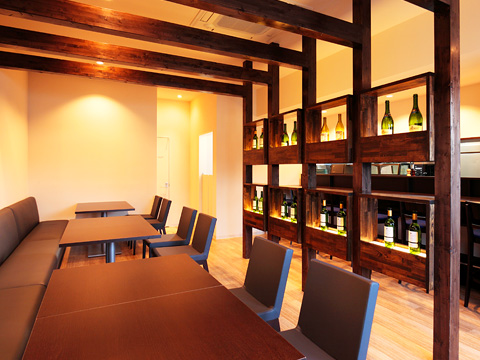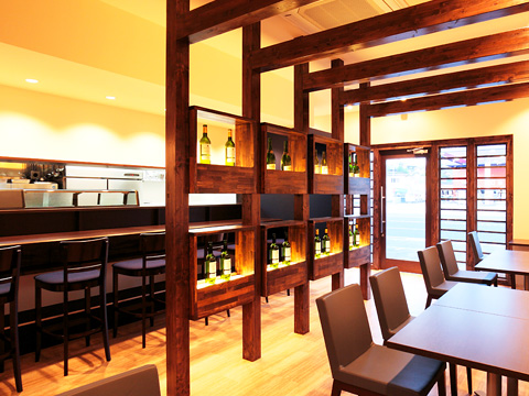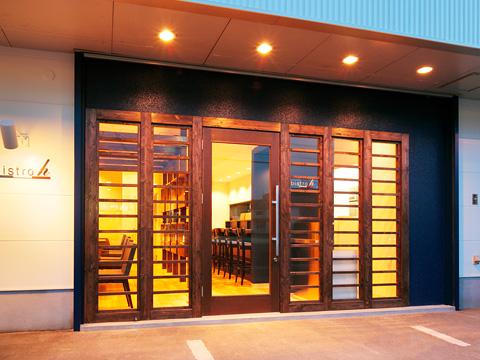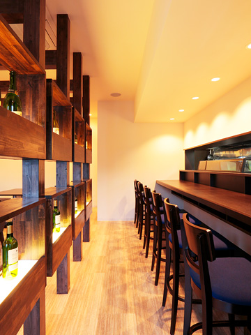 【ビストロアッシュ】 フレンチレストランの新装工事。ベージュとこげ茶を基本色にして、ブルーのゲートをワンポイントに使っています。テーブル席とカウンターの間には間接照明付きのボトル棚が、落ち着きを醸し出します。
