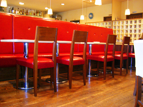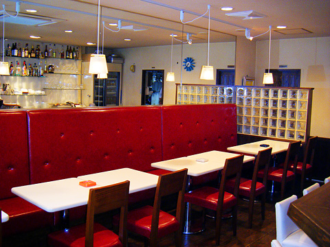 【Base Cafe】 本格イタリアンが楽しめるシェフのお店です。料理との色の調和を意識して、配色は赤をポイントにしました。ソファーはボタンを付けて高級感を演出。壁面もアンティーク調に仕上がりました。