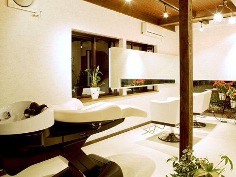 【Kiseky】 女性オーナーの美容室。全体的にやさしい雰囲気の中にこげ茶の天井が洋風のイメージを出しています。カウンターは、手作りの雰囲気を出すためにあえてプロの職人ではなく、当社スタッフが塗装をしました。